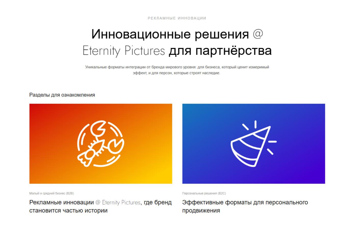 В основе сервиса лежит ключевое отличие: Eternity Pictures — это прежде всего кинопроизводственный бренд, официально зарегистрированный в РФ (свидетельство на товарный знак получено в 2025 году). Сервис использует внутреннюю экспертизу создания контента для проектирования интеграций, которые становятся неотъемлемой частью сюжета, а не вставкой в готовый продукт.